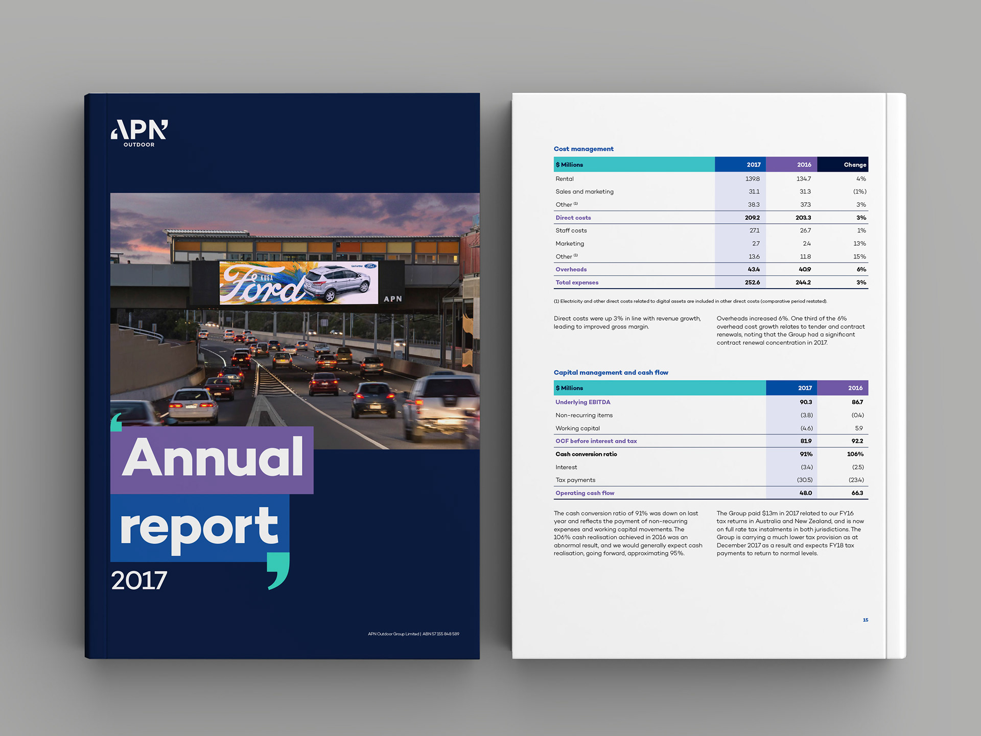 APN Outdoor 2017 annual report cover and page layout design. Keeping things very simple and adopting the new brand's refreshed colour palette.
